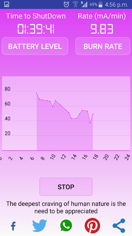 Users remain in uncertainty about whether to continue playing a game or watching a movie as such activities for some hours which drain the battery quickly in comparison to engaging in other activities on any mobile device. This app let you know of your current burn rate and time remaining with current level of usage. This will enable you to make decisions on what to do next.