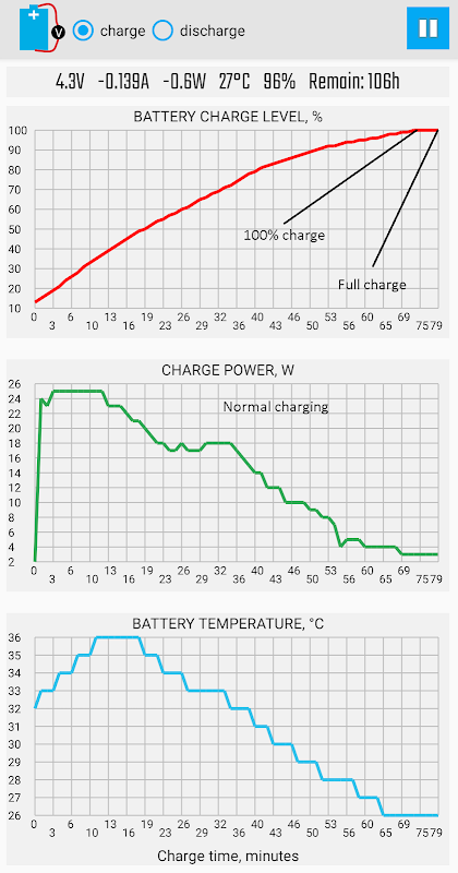 * attention, l'application mesure tous les paramètres électriques exactement sur la batterie, pas sur la sortie du chargeur ! Par conséquent, tous les paramètres seront différents de ceux affichés par le testeur USB.