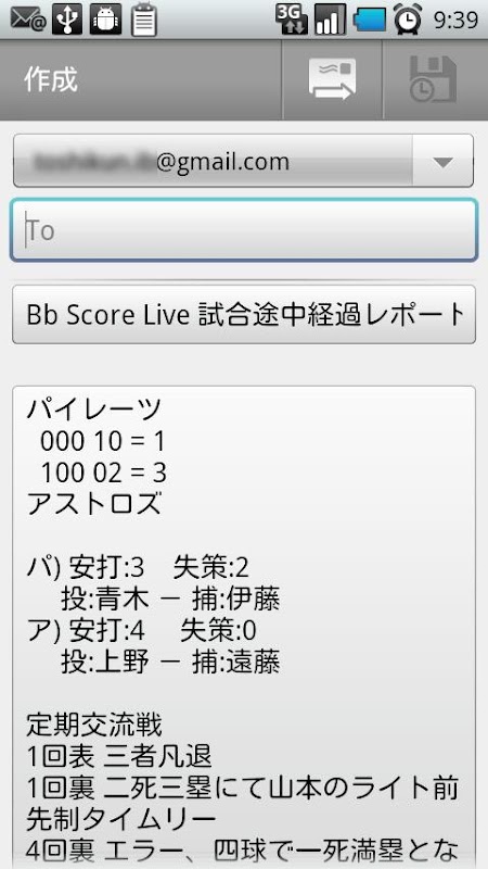 そして、友達に知らせたい時に「送信」ボタンを押せば、試合内容を見やすい文章に整形して、メール本文やTwitterに送信できます。