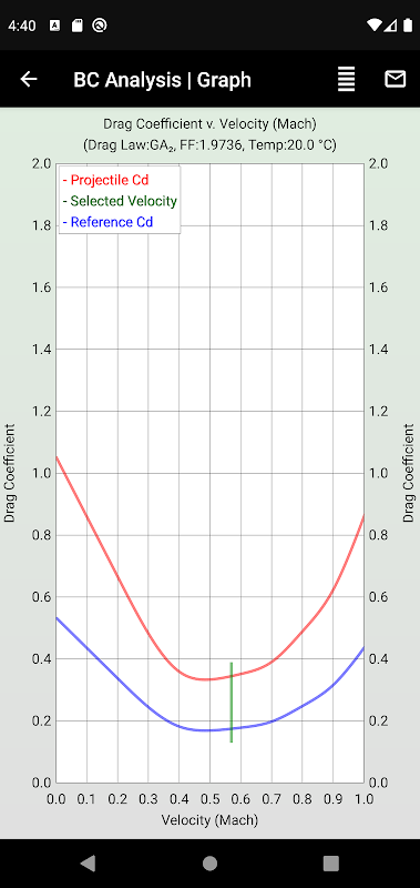 Compte tenu du poids du projectile, du diamètre, du coefficient balistique et de la loi de traînée pertinente, cette application détaille la densité de section, le facteur de forme, le coefficient de traînée du projectile et le coefficient de traînée de référence (par rapport à la vitesse particulière, à la température ambiante et à la loi de traînée).
