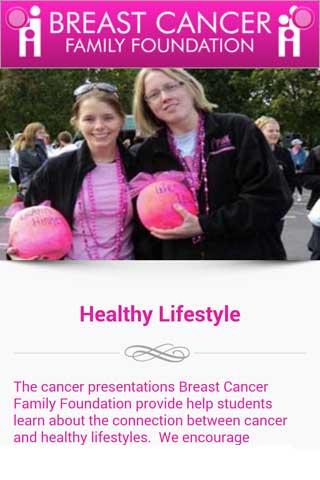 La mission de la Fondation du cancer du sein de la famille à «inspirer les gens dans notre communauté pour mener une vie saine sans cancer» est la force motrice de tout ce que nous faisons. Nos programmes éducatifs discutent toutes les formes de cancer, mettant l'accent sur la sensibilisation, les méthodes de détection précoce, et les habitudes de vie saines. Les élèves apprennent des habitudes saines (nutrition, exercice, détection, etc.), ils peuvent adopter maintenant pour aider à réduire leur risque de développer un cancer plus tard dans la vie.