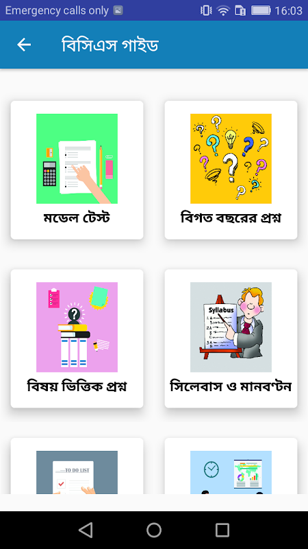 Cette application est divisée en six sections principales. Parmi les exemples, citons le modèle de modèle d'examen préliminaire BCS, le syllabus Syllabus et les ressources humaines, les questions et réponses thématiques, les réponses aux questions de l'année passée, les directives et les conseils d'entretien.