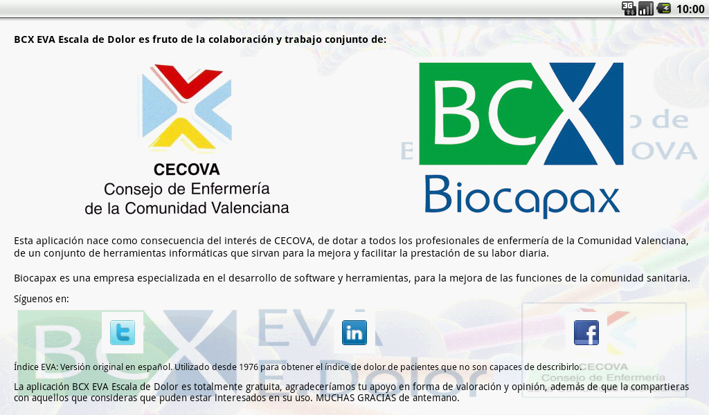 IMPORTANTE: BCX EVA Escala del Dolor es una aplicación pensada para su utilización por personal sanitario, cuidadores y familia. Cualquier mal uso o uso inadecuado de ella no es responsabilidad de los creadores. El profesional siempre deberá verificar la corrección de la valoración generada por la aplicación que es meramente orientativa y basada en el índice original.