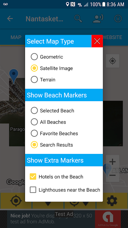 & # 8226; Afficher les groupes de marqueurs - Utilisez les paramètres de la carte pour afficher les hôtels et les phares situés près de la plage
