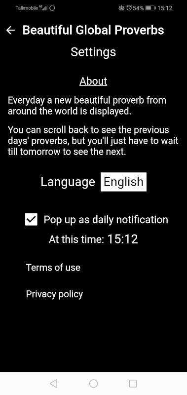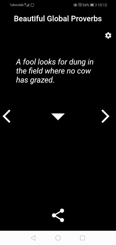 Application légère super simple, seulement deux pages. Affiche chaque jour un nouveau proverbe du monde entier avec sa signification. Peut également parcourir tous les proverbes précédents, peut partager un proverbe avec des amis et peut définir une notification contextuelle quotidienne si vous le souhaitez.