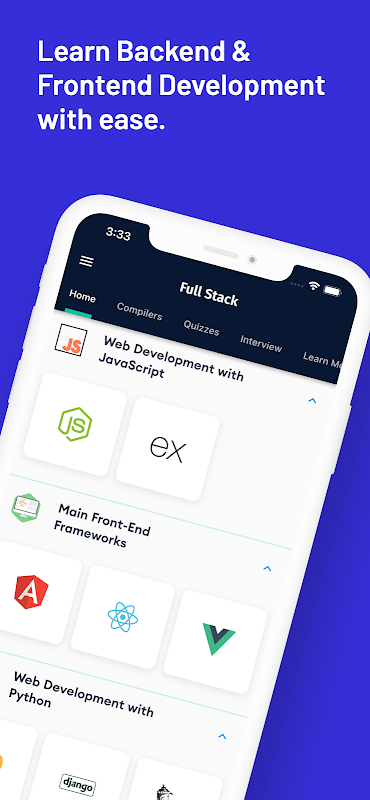 Notre application couvre tous les concepts et outils essentiels dont vous avez besoin pour devenir un développeur full stack, y compris le développement frontend avec HTML, CSS et JavaScript, le développement Web avec des frameworks backend populaires comme Django, Flask, Laravel, CodeIgniter, Ruby on Rails et Spring et des bibliothèques telles que Firebase, GraphQL, Webpack et Postman. Nous fournissons également un compilateur pour de nombreux langages de programmation, ainsi que des quiz interactifs, des questions d'entretien et d'autres fonctionnalités pour vous aider à évaluer vos progrès et à rester engagé dans le processus d'apprentissage.