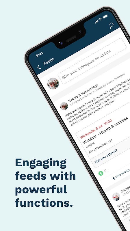 L'application vous permet de lire les dernières actualités internes, de publier des informations et de partager votre vie quotidienne au travail. Il fournit également un bon aperçu de ce qui se passe et des événements à venir. La fonction de chat assure des réponses rapides de vos collègues.
