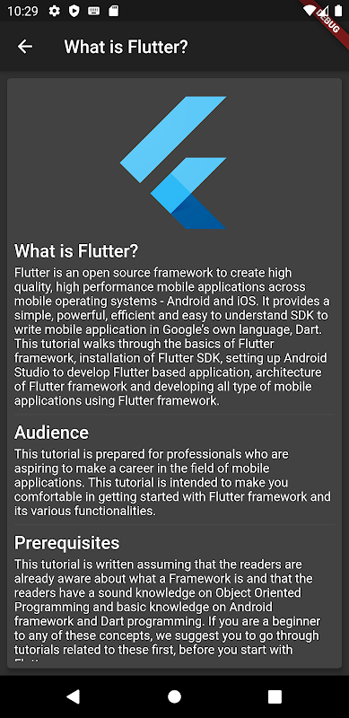 Flutter is an open source framework to create high quality, high performance mobile applications across mobile operating systems - Android and iOS. It provides a simple, powerful, efficient and easy to understand SDK to write mobile application in Google’s own language, Dart. This tutorial walks through the basics of Flutter framework, installation of Flutter SDK, setting up Android Studio to develop Flutter based application, architecture of Flutter framework and developing all type of mobile applications using Flutter framework.
