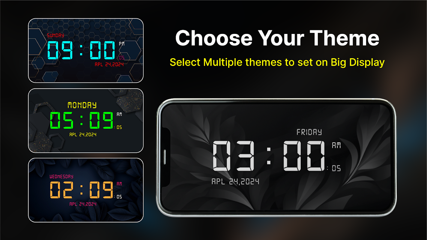 Cette application numérique à grand affichage d'horloge fournit un énorme affichage d'horloge numérique qui couvrira votre appareil avec une minuterie numérique et des thèmes d'horloge numérique.