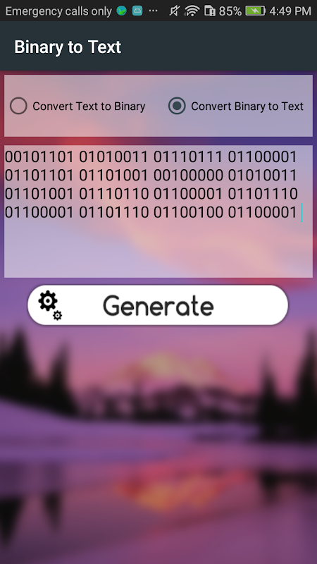 Binary to Text converter– Text to Binary app is a free, quick and secure app to convert text to binary and binary to text. Try the app now and share with friends and talk privately. Please provide your feedback about binary translator app so that we can improve it and fix the issues.