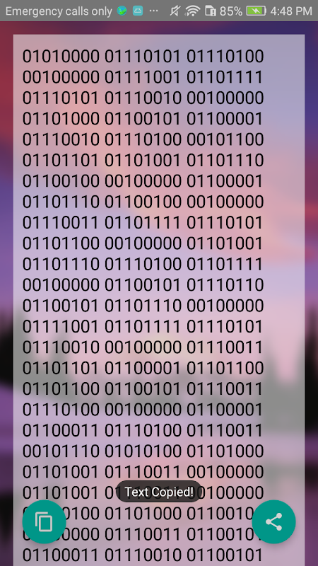 Binary to text converter is the best way to encode your confidential messages and share it with others so that they can decode it later with this binary translator app. It has copy button to easily copy and forward to anyone. You can share it as well using sharing the feature of Binary to text converter.