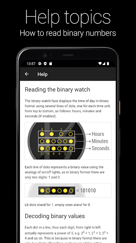 • Rubriques d'aide pour la lecture de la montre binaire.