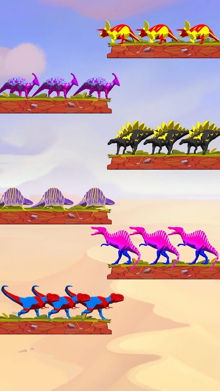 - Les joueurs doivent trier les couleurs, quatre mêmes dinosaures dans l'ordre pour le niveau suivant dans le puzzle des animaux sauvages. Il n'y a pas de mode raté, seulement un champion gagnant, mais vous devez tout de même faire face à des énigmes de tri.