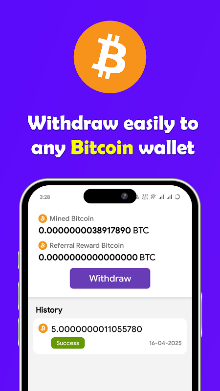 Cette application est conçue pour les personnes souhaitant miner des bitcoins sans connaissances techniques spécialisées, sans plateformes de minage coûteuses ni consommation électrique élevée. Que vous soyez débutant en technologie blockchain ou déjà familier avec les actifs numériques, cette plateforme offre un environnement accessible pour commencer à gagner de l'argent grâce au minage.