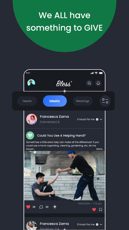 Partager un besoin. Satisfaire un besoin. Unir l'humanité par le pouvoir de Bless.