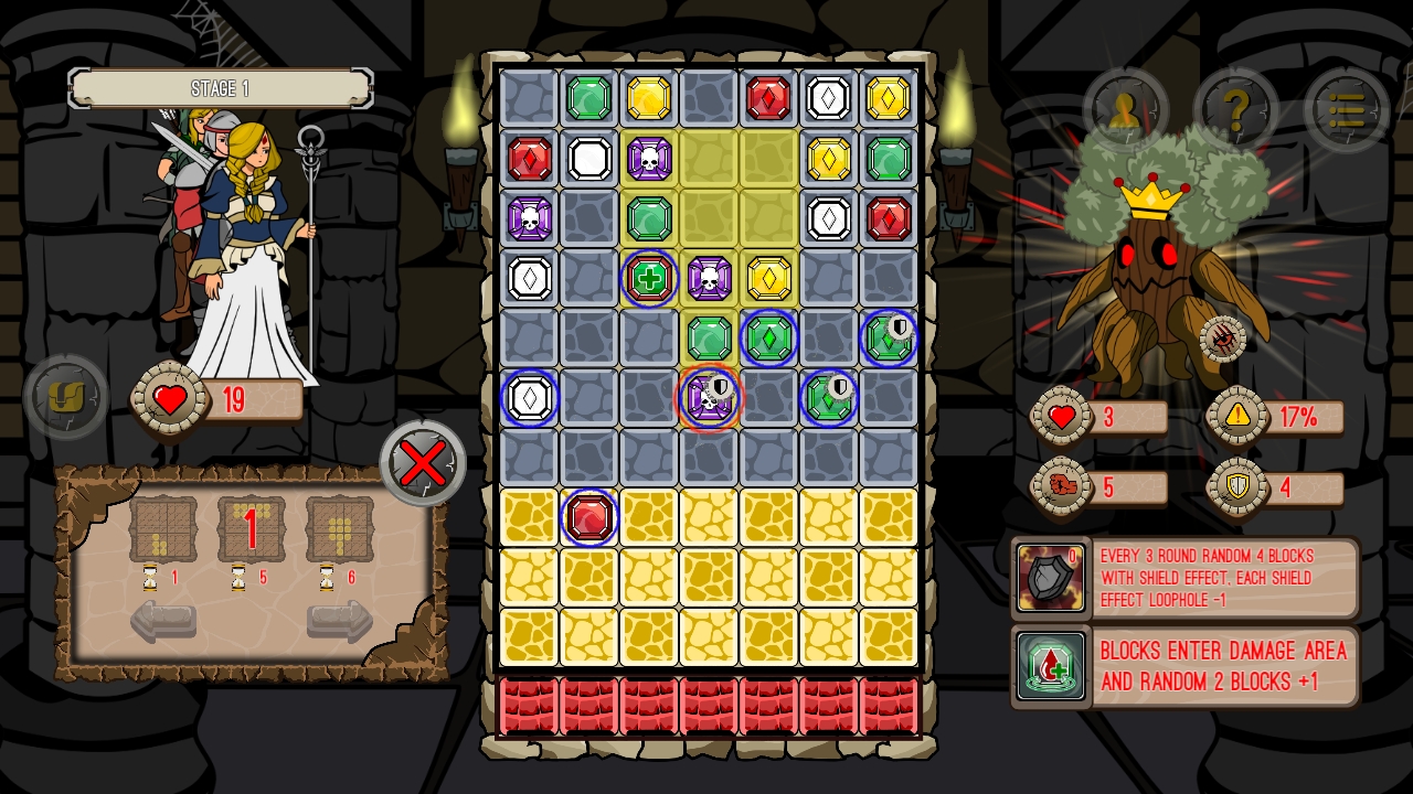 Pick your team with 3 adventurers, explore and clean the dungeon! Cast your skill based on Color Matching to destroy incoming blocks with every round and try to damage the dungeon’s boss when you can.