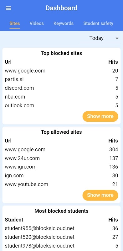 L'application mobile Blocksi Delegate est intégrée à l'application Blocksi Manager Education Everywhere et fournit des analyses pour suivre les performances de l'école. Les délégués peuvent inclure, mais sans s'y limiter, les directeurs, les directeurs adjoints, les surintendants, les conseillers d'orientation, les équipes techniques spécifiques à l'école, les enseignants spécifiques et les agents de ressources.