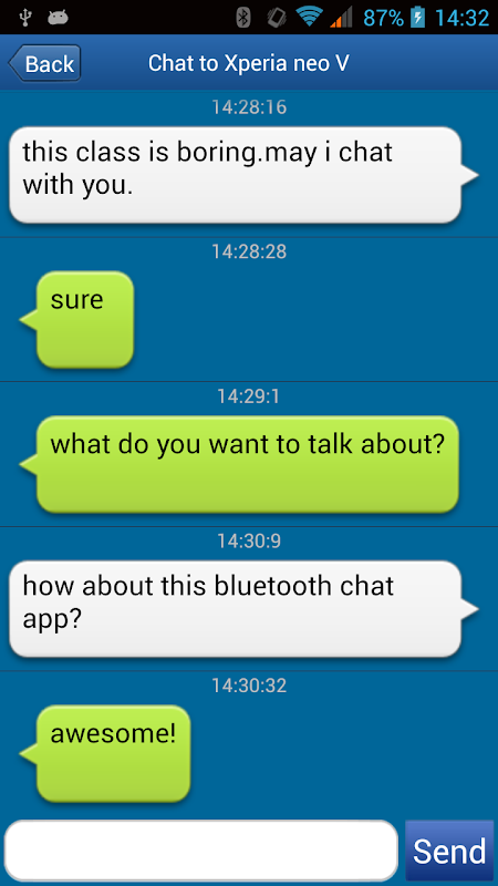 BTW:This is a simple bluetooth chat,please use this app with bluetooth enable android phones. This app is embed with Admob.