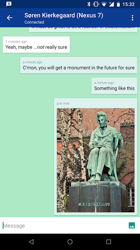 Bluetooth chat vous aidera à envoyer des messages et des images courtes en utilisant la technologie Bluetooth. Vous pouvez discuter avec vos amis si vous êtes dans la gamme Bluetooth et n'ont pas accès à Internet.