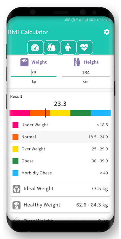 Ideal weight - app calculates the ideal weight you should gain. It gives you an idea of whether you’re "underweight", a "healthy weight", "overweight", or "obese" for your height. BMI is one type of tool to help health professionals assess the risk for chronic disease.
