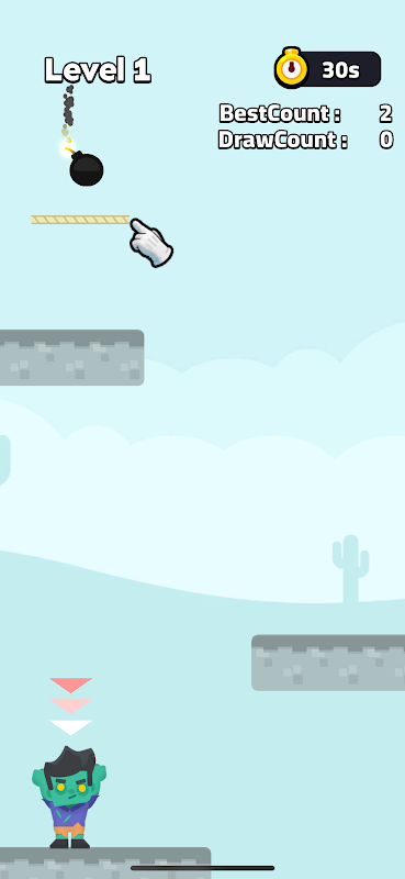 La mécanique de base de BombDrawLine consiste à tracer des lignes sur votre écran avec votre doigt. Ces lignes servent de chemins ou de barrières pour les bombes. Une fois qu'une ligne est tracée, toute bombe qui entre en contact avec elle rebondira ou changera de direction en fonction de l'angle et de la courbure de la ligne. Le but est de manœuvrer ces bombes pour frapper des zombies positionnés à différents niveaux sans faire exploser les bombes prématurément.