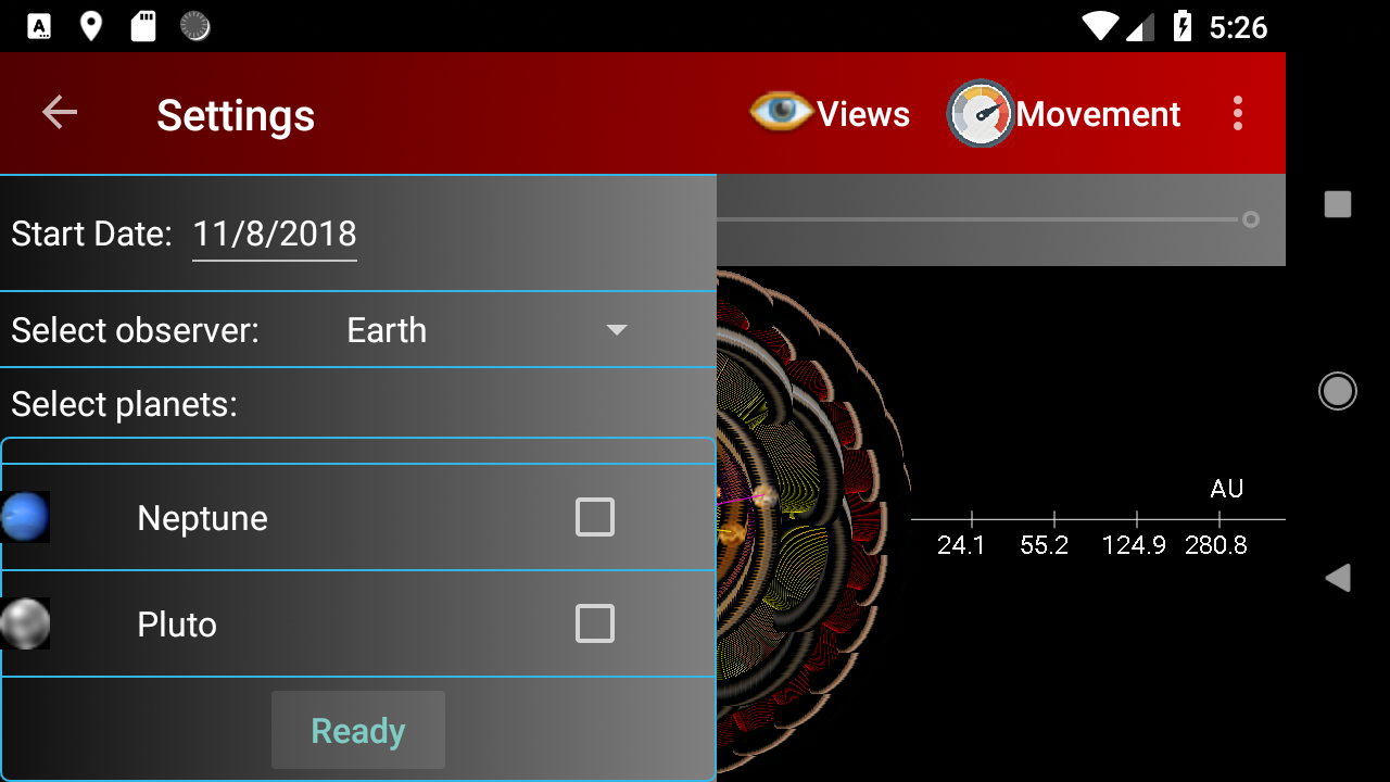 Vous pouvez laisser les planètes se déplacent par étapes simples ou les laisser courir en permanence. La vitesse peut être modifiée par un curseur de vitesse.