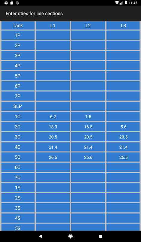 3. Allez à l'écran ligne qté / section (en appuyant sur la touche « qté / section Line ») et entrez la quantité de chaque section de ligne, selon le cas (à prélever sur les tables d'étalonnage du réservoir du navire).