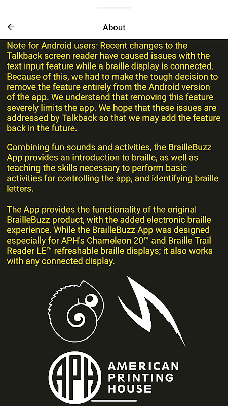 L'application offre les fonctionnalités du produit Braille Buzz original, avec en plus l'expérience braille électronique. Conçue spécialement pour les afficheurs braille actualisables Chameleon 20™ et Braille Trail Reader LE™ d'APH, l'application Braille Buzz est également compatible avec tout écran connecté.