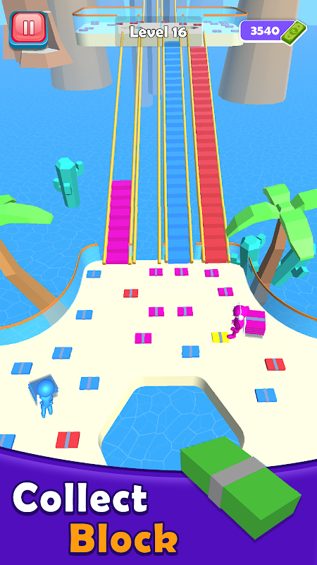 Rejoignez l'aventure avec plus de 500 niveaux qui contiennent des mécanismes tels que des toboggans, des trampolines, des tyroliennes, des échelles et des ascenseurs ! Collectez des blocs de votre propre couleur et construisez des ponts avec eux.