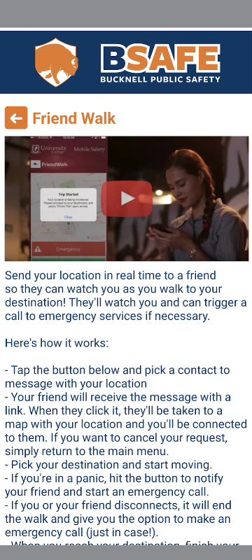 - Notifications de sécurité : recevez des notifications et des instructions instantanées de la part de la sécurité de l'Université Bucknell en cas d'urgence sur le campus.