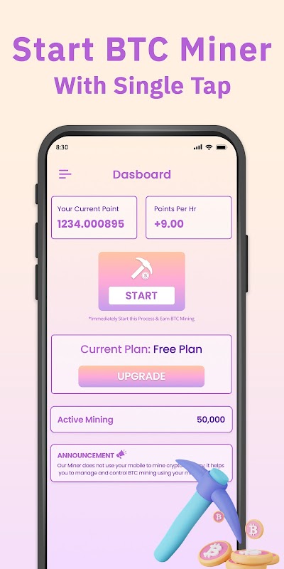 Tous les processus de minage sont réalisés par des serveurs Cloud. La connexion Internet sur votre appareil est tout ce dont vous avez besoin pour démarrer. Le simulateur d'exploitation minière ne nécessite aucune compétence particulière ni paramètres compliqués. Appuyez sur le bouton et démarrez le processus maintenant !