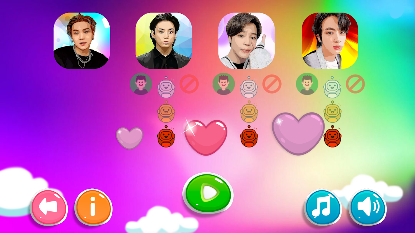 Ce jeu contient 7 groupes thématiques — «V», «J-Hope», «Jin», «RM», «Jimin», «Jungkook» et «Suga». Vous pouvez choisir n'importe lequel d'entre eux ou mélanger les cartes de tous ces groupes en appuyant sur le bouton "MIX". En cas de doute, appuyez sur le bouton "Dés" pour sélectionner au hasard un groupe à jouer.