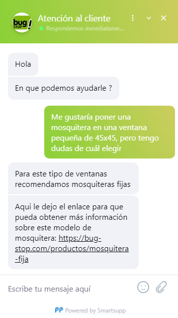 Disponemos de un equipo de soporte que te ofrece asesoramiento continuo antes, durante y después de tu compra en Bug Stop. Puedes contactar con nosotros mediante nuestro chat o nuestro email para realizarnos cualquier consulta. ¡Estaremos encantados de atenderte!