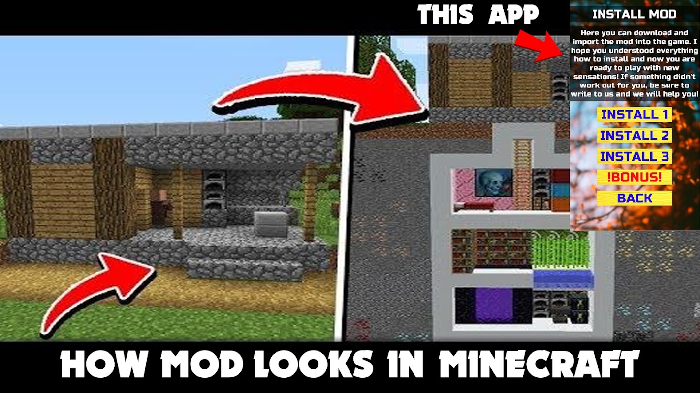 Ceci est une application non officielle. Le nom, la marque et les actifs sont la propriété du propriétaire Mojang AB. L'application permet d'installer et de se familiariser avec le mod pour le jeu Minecraft, ce n'est pas un jeu, mais un add-on avec des instructions !