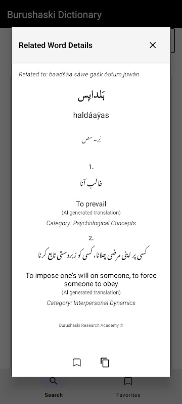 L'application rend le burushaski accessible grâce à une interface simple et moderne. Les utilisateurs peuvent effectuer des recherches parmi :