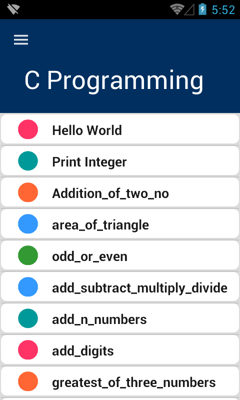 Cette application vous permet d'effectuer des notes de base de programmation en C dans votre Android. Il contient environ plus de 90 programmes C, et beaucoup FAQ. Il est l'interface utilisateur très simple et le contenu peut être facilement comprise par les utilisateurs.