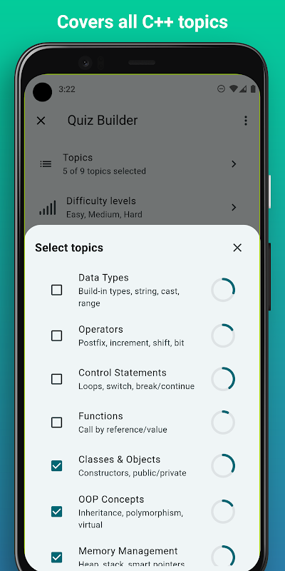 Testez vos compétences en C++ avec plus de 415 questions stimulantes ! Parfaite pour les débutants comme pour les experts, cette application propose des explications détaillées pour chaque réponse, vous aidant à apprendre et à vous améliorer au fur et à mesure. Que vous révisiez les bases ou abordiez des concepts avancés, ce quiz C++ améliorera vos connaissances en codage.