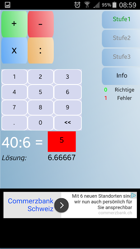 Diese Rechnen App dient zur Übung von Addierungsrechnungen, Subtrahierungen, Divisionen und Multiplikationen.