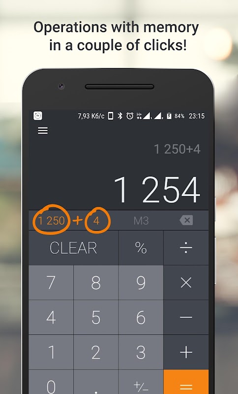 ✔ ability to erase the whole calculation (CLEAR) or the extreme numbers (BACKSPACE);