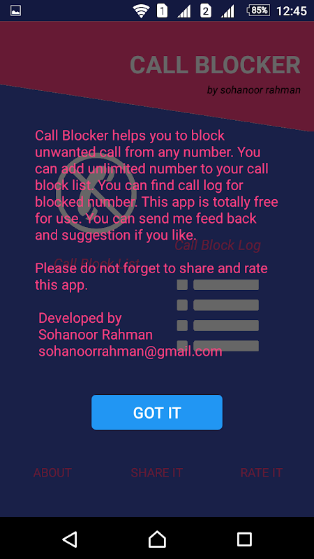 Call Blocker is a simple app for your android device which helps you block incoming call from any unwanted number. You can add unlimited numbers of contact in your block list. Whether you like it or not you can see the block list call log from "Call Block Log" With very simple UI, we try to focus on it performance. Hope you like it. You can send your valuable feedback through email "[email protected]".