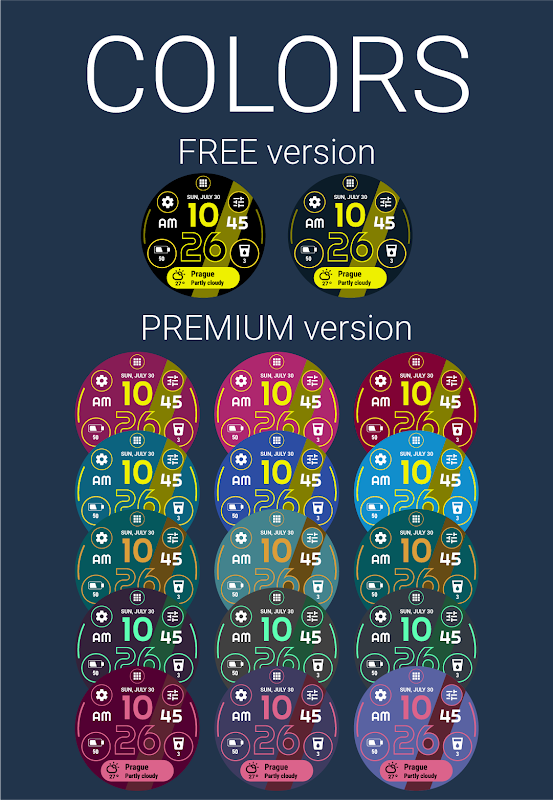Vous pouvez modifier tous les paramètres ou ajuster toutes les fonctionnalités (la version PREMIUM) ou toutes les fonctionnalités gratuites dans la configuration Watch Face de la montre. Vous pouvez également installer une application compagnon qui vous permet de modifier facilement tous les paramètres ou d'ajuster toutes les fonctionnalités.