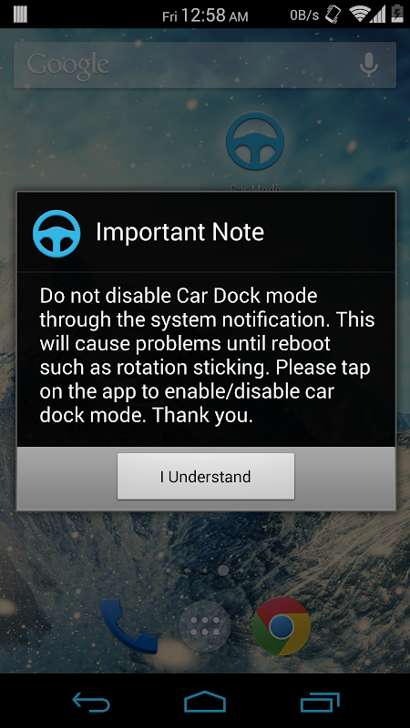 This is a super simple app that enables and disables the Car Dock function. Once given the super user permission, you can just tap on the app in your app drawer or leave it as an app on your homescreen that sort of doubles as a 1x1 widget but as an app icon.