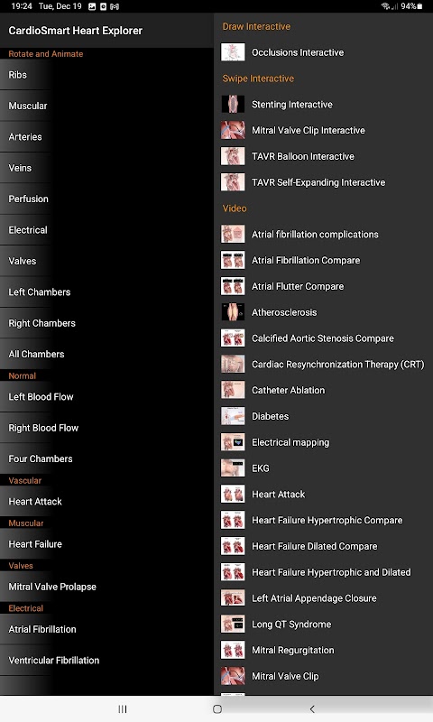 - Depuis le menu principal, explorez rapidement la structure d'un cœur battant en 3D animé en faisant glisser votre doigt vers le haut ou vers le bas à travers 9 couches de base de l'anatomie cardiaque rotative. Faites glisser de gauche à droite pour faire pivoter chaque image d’une vue antérieure à postérieure. Appuyez deux fois pour ramener chaque image à la vue antérieure des battements.