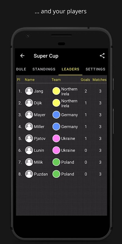 Partage simplement un tournoi avec tes amis pour qu´ils peuvent suivre les équipes et les matches en direct.