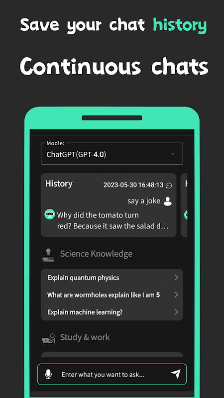 Chat AI Master - GPT AI Chat Bot est une application de chatbot révolutionnaire qui tire parti du puissant support de GPT4.0 pour offrir aux utilisateurs une expérience de conversation intelligente inégalée. Il offre la commodité d'une communication multilingue, vous permettant de vous engager sans effort avec le bot dans votre langue préférée. Avec l'interaction vocale, vous pouvez profiter de conversations naturelles et fluides, comme si vous discutiez avec une personne réelle.