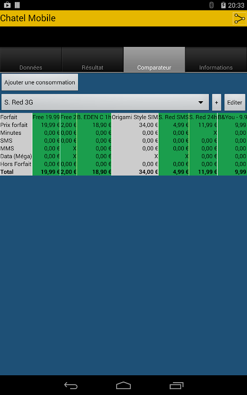 Vous pouvez ajouter les forfaits que vous trouvez et à partir des consommations que vous renseignez Chatel Mobile s'occupe de comparer les forfaits afin de trouver celui qui correspond le mieux à votre consommation.