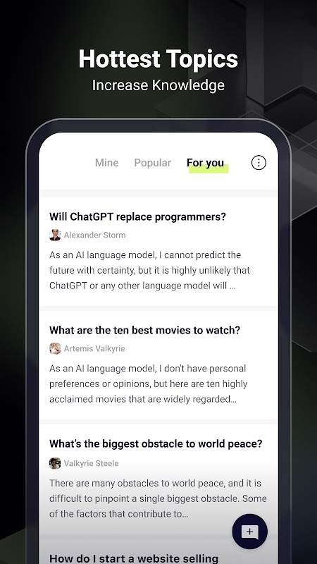 ChatWiz ne consiste pas seulement à recevoir des réponses à des informations - il s'agit également de partager vos questions avec d'autres, une plate-forme de partage de connaissances sur une variété de sujets, notamment la science, la technologie, la nourriture, les voyages, la musique, les livres, etc. Avec ChatWiz, vous pouvez voir les questions et réponses les plus chaudes dans tous les domaines de la connaissance et satisfaire votre curiosité.
