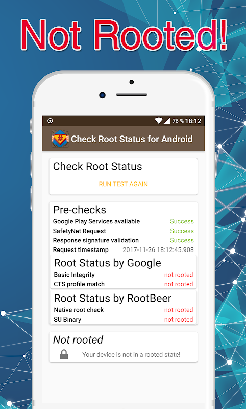 «Vérifier l'état de la racine pour Android - avec SafetyNet» est une application de vérification de racine facile à utiliser qui vérifie si votre appareil Android a un accès su. Connaître le statut de super utilisateur d'Android peut être fait en exécutant un simple test sur l'application. L'application vérifie la racine avec l'API SafetyNet de Google et la vérification de la racine native.