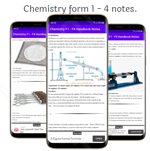 Chimie : F1 - F4 Caractéristiques du manuel Formulaire de chimie 1 - formulaire 4 Notes standardisées du KCSE. L'application contient des notes allant du formulaire 1 au formulaire 4. Chimie: F1 - F4 Le manuel est conçu pour doter les apprenants, les enseignants et les autres utilisateurs des connaissances, des compétences et de l'expertise sur la manière de gérer les examens relatifs aux examens de chimie. L'application propose les sujets suivants basés sur la chimie :
