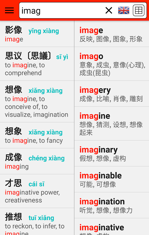 • La recherche la plus puissante: recherchez des mots en anglais, en caractères chinois, en pinyin (nombre et marque de tonalité), ou une combinaison, la prise en charge des caractères génériques et la recherche en texte intégral en chinois et en anglais et également en mesure d'afficher les résultats dans la liste duo à une fois que.